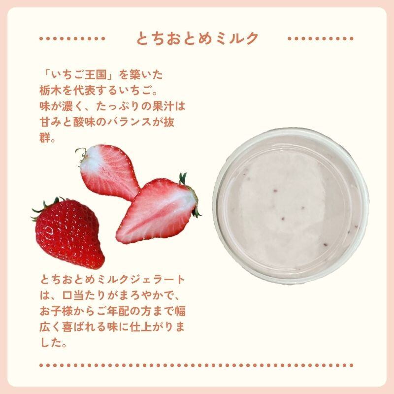 とちひめソルベ、ミルキーベリーソルベ、とちおとめミルクの3種類のジェラートを各2個ずつのセットでお届けいたします。