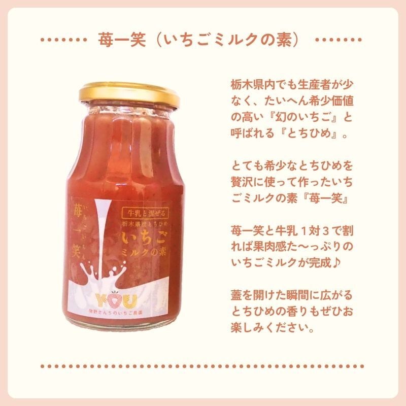 幻のいちご「とちひめ」を使ったいちごミルクの素「苺一笑」は、お客様の声から作られた商品。完熟のとちひめと砂糖のみで作られています。