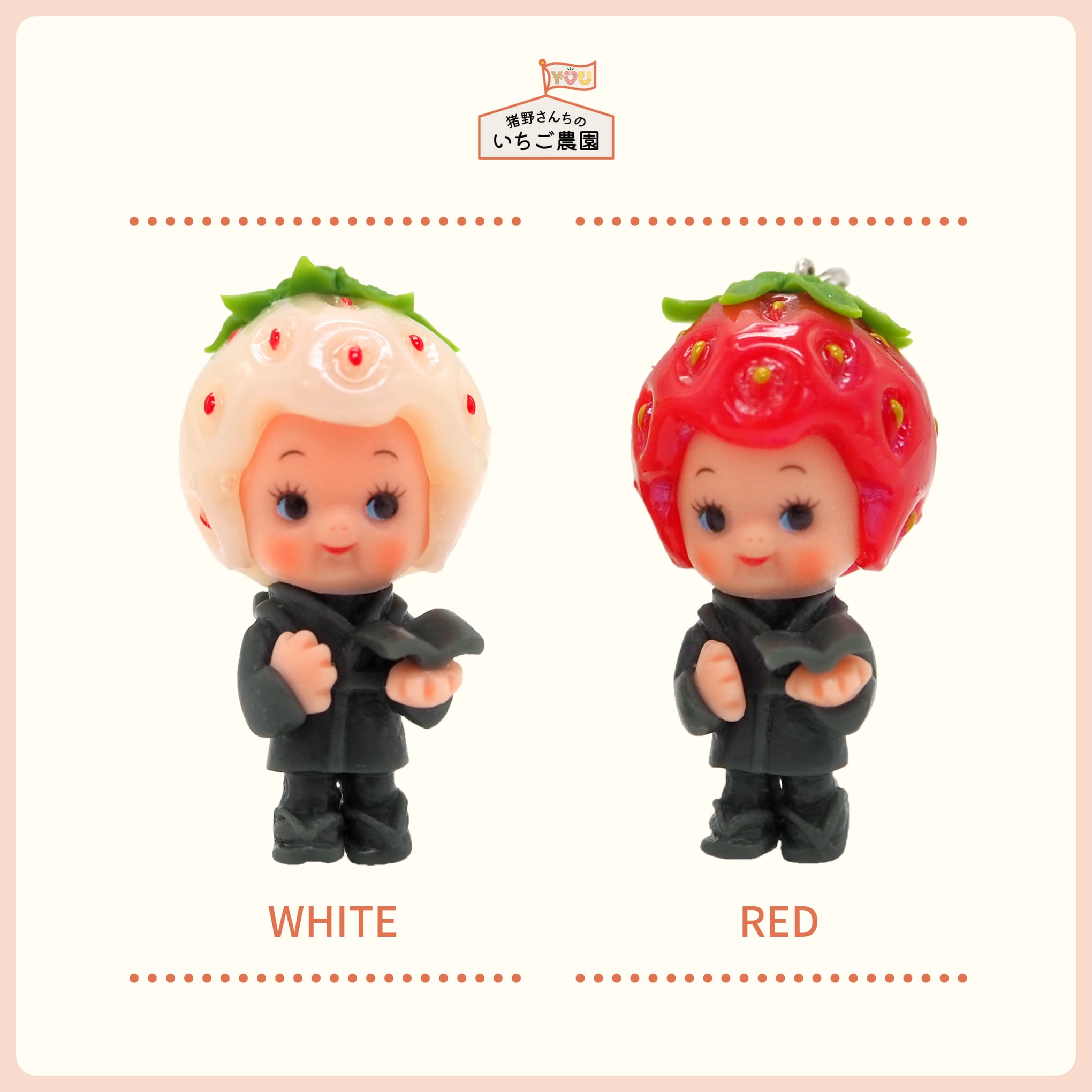 その銅像のコスチュームを身に着けたキューピーちゃんにいちごの被り物をかぶらせて、かわいいストラップにしました。